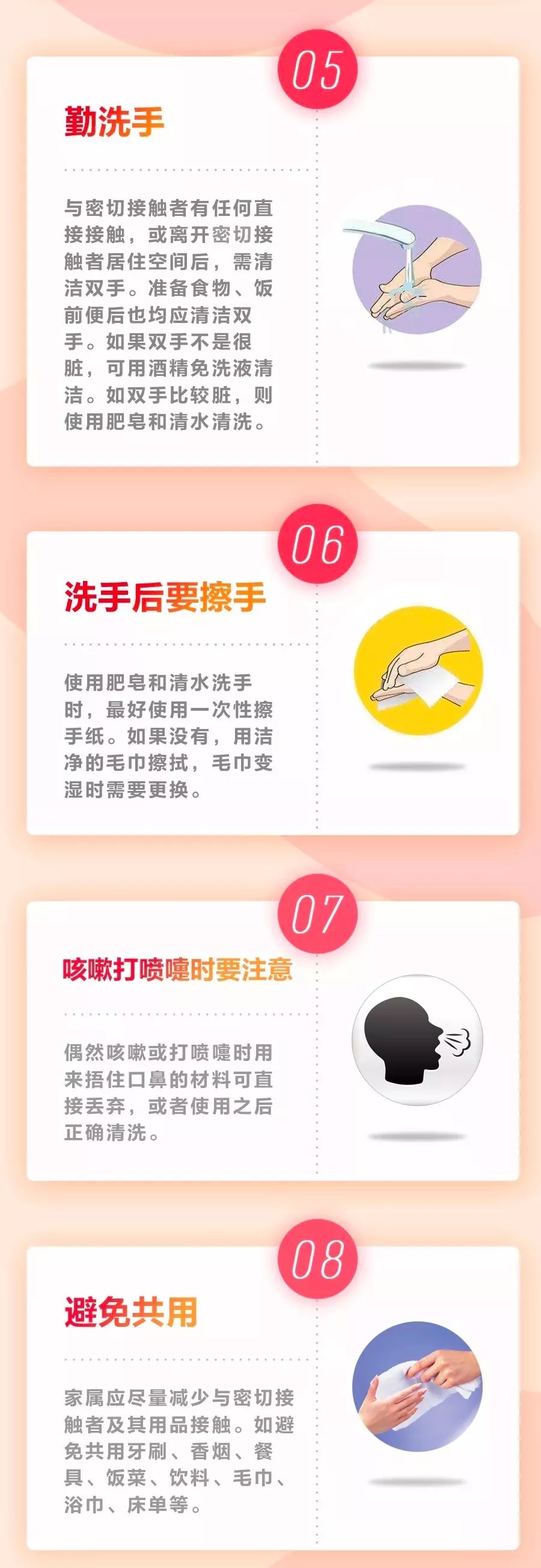 新型冠狀病毒感染的肺炎確診病例的密切接觸者,應(yīng)從和病人接觸的最后一天起采取醫(yī)學(xué)觀察14天。在家中觀察期間,需與醫(yī)學(xué)觀察人員保持聯(lián)系,并需要了解病情觀察和護理要點,掌握家庭預(yù)防的洗手、通風(fēng)、防護和消毒措施。