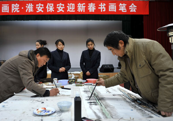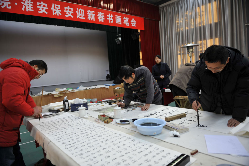 元月16日下午,由淮安書(shū)畫(huà)院和總公司聯(lián)合舉辦的“迎新春書(shū)畫(huà)筆會(huì)”活動(dòng)在公司活動(dòng)中心舉行。公司總經(jīng)理婁伯翱、副總經(jīng)理王克、徐文剛和各部門(mén)負(fù)責(zé)人蒞臨活動(dòng)現(xiàn)場(chǎng),部分保安隊(duì)伍和押運(yùn)隊(duì)伍中的書(shū)畫(huà)愛(ài)好者到現(xiàn)場(chǎng)觀摩學(xué)習(xí)。會(huì)上,書(shū)畫(huà)們齊集一堂,創(chuàng)作了一幅幅書(shū)畫(huà)精品,彰顯了保安文化特色,贏得了在場(chǎng)觀摩者們的贊賞與好評(píng)。