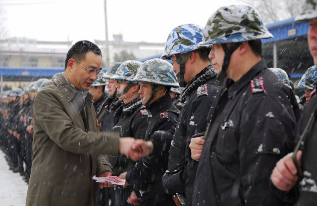2月14日大年初一上午,總經(jīng)理婁伯翱、副總經(jīng)理王克、徐文剛以及公司黨總支委員、公司各部負責人一起冒雪慰問了執(zhí)行任務的武裝押運員,婁伯翱總經(jīng)理代表黨總支向大家拜年并致以節(jié)日的問候和祝福。然后,婁伯翱總經(jīng)理在保安部陪同下,慰問了市國稅局、供電局、易初蓮花超市等人防執(zhí)勤點;副總經(jīng)理王克和徐文剛分別驅車慰問外派保安隊員。