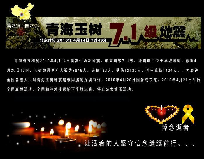 新華社4月20日電 為表達全國各族人民對青海玉樹地震遇難同胞的深切哀悼,國務院決定,2010年4月21日舉行全國哀悼活動,全國和駐外使領館下半旗志哀,停止公共娛樂活動。
