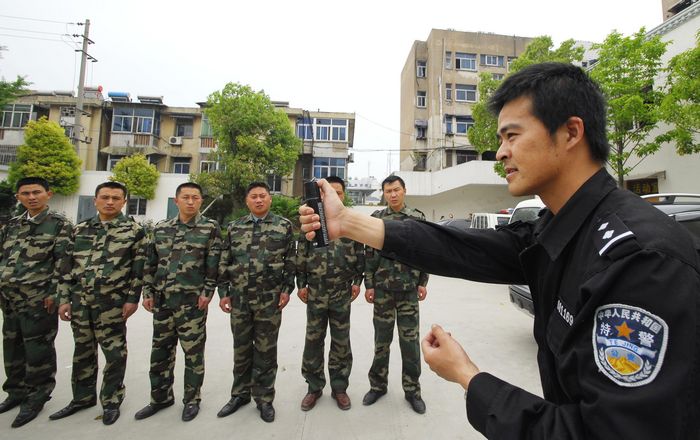 特警為校園特衛(wèi)人員講解示范催淚噴射器的正確使用