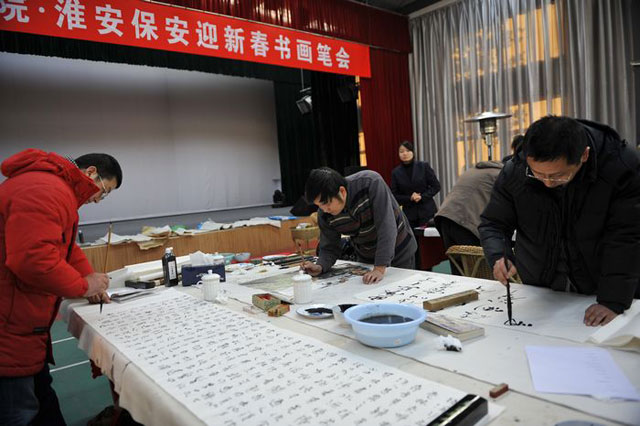 為表達(dá)書(shū)畫(huà)藝術(shù)界人士對(duì)保安隊(duì)伍的關(guān)愛(ài),元月16日,淮安書(shū)畫(huà)院書(shū)畫(huà)家走進(jìn)市保安公司進(jìn)行新春慰問(wèn),書(shū)畫(huà)家們揮毫潑墨,作品寓意深刻,彰顯了保安文化特色,為保安員工奉獻(xiàn)了一份藝術(shù)大餐。