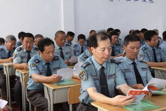 圖為:培訓隊員,在課堂上仔細閱讀保安服務培訓教材。