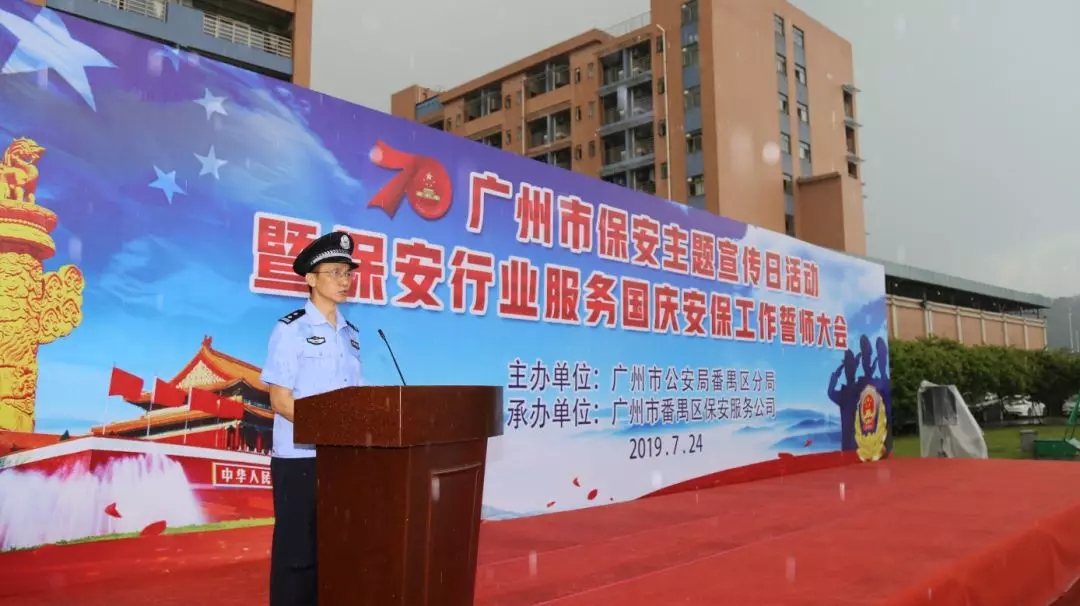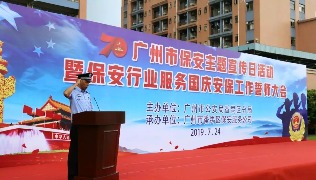 “不忘初心跟黨走,牢記使命勇?lián)?dāng)”。為扎實(shí)做好國慶70周年大慶安保維穩(wěn)工作,確保社會(huì)治安穩(wěn)定。7月24日上午,番禺區(qū)保安服務(wù)公司在公司運(yùn)動(dòng)場(chǎng)隆重舉行保安主題宣傳日活動(dòng)暨保安行業(yè)服務(wù)國慶安保工作誓師大會(huì)。廣州市公安局番禺區(qū)分局治安大隊(duì)葉文福副大隊(duì)長(zhǎng)、三級(jí)警長(zhǎng)何靖毅出席了大會(huì),公司黨支部書記謝燕彪、副書記陳志雄、委員溫遠(yuǎn)峰和300多名保安從業(yè)人員參加了大會(huì),大會(huì)由公司支部委員溫遠(yuǎn)峰主持。