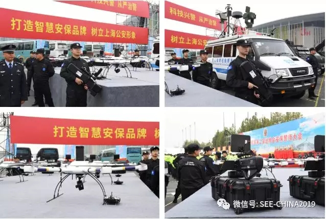 上海保安集團警盾無人機團隊亮相誓師大會現(xiàn)場,展示新型科研設備。