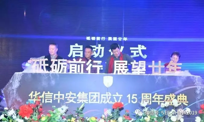藍(lán)圖繪就,正當(dāng)揚帆破浪!? 任重道遠(yuǎn),更需策馬揚鞭!會議尾聲,中國保安協(xié)會栗萍女士、北京保安協(xié)會副秘書長何鋼先生、上級監(jiān)管單位顧巖先生與華信中安集團(tuán)董事長殷衛(wèi)宏先生共同上臺,開啟按鈕拉開展望二十年序幕。