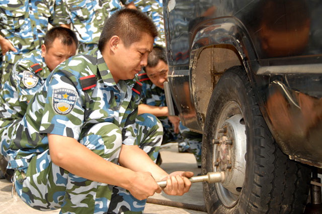 2008年8月3日上午,一名押運駕駛員在爭分奪秒地更換輪胎。當日,淮安保安總公司舉行了運鈔車駕駛員技能大比武,來自市區(qū)的50余名運鈔車駕駛員冒著酷暑進行了障礙駕駛、更換輪胎、車輛故障排除等駕駛技能的角逐。