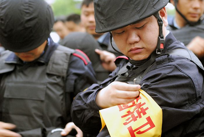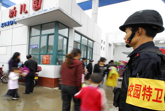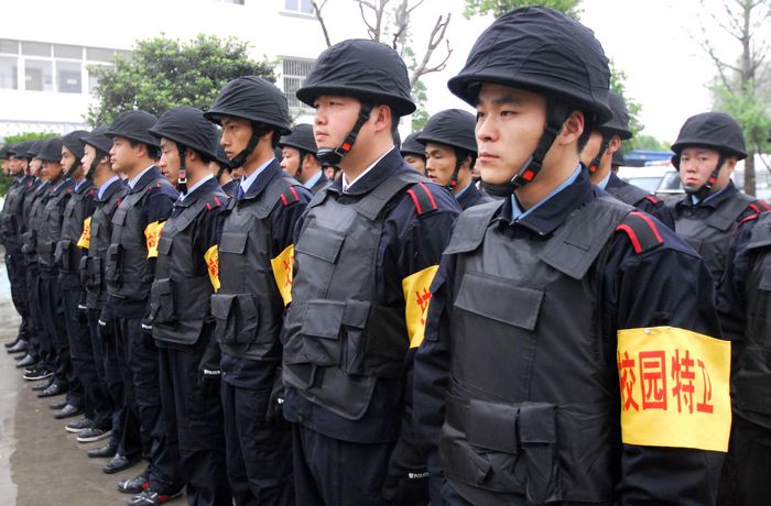 2010年5月5日早晨6時(shí)許,全副武裝的校園特衛(wèi)人員整裝待發(fā)。自當(dāng)日起,江蘇省淮安市首批46名配備鋼盔、防刺服、防割手套、防暴膠棒、滅火槍、催淚器等防護(hù)裝備的專職校園特衛(wèi)人員開(kāi)始進(jìn)駐市直23所中小學(xué)和幼兒園,守護(hù)校園平安。這些人員都是從全市保安隊(duì)伍中精選出來(lái)的骨干,年齡在35歲以下,大都有部隊(duì)服役的經(jīng)歷,身體素質(zhì)和政治素質(zhì)較好,且受過(guò)專業(yè)訓(xùn)練。