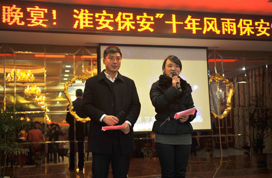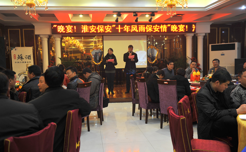 19:18分,晚宴準(zhǔn)時(shí)開(kāi)始!首先是在公司工作了20幾年的財(cái)務(wù)部李萬(wàn)晴和消防分公司周鵬上臺(tái)講述了自己二十幾年的保安情。講述了曾經(jīng)公司由一窮二白經(jīng)過(guò)努力到今天多元化的發(fā)展。緊接著是曾經(jīng)在公司工作過(guò)但現(xiàn)在離開(kāi)的趙長(zhǎng)林講述了自己從工作到離開(kāi)和淮安保安一段難忘的經(jīng)歷。后來(lái),黨委副書(shū)記吳淮甫、副總經(jīng)理王克分別上臺(tái)講話。最后婁總上臺(tái)發(fā)表了熱情洋溢的致辭,感染了在場(chǎng)的每一名員工。婁總對(duì)淮安保安未來(lái)的發(fā)展充滿信心,也表達(dá)了堅(jiān)定的決心。