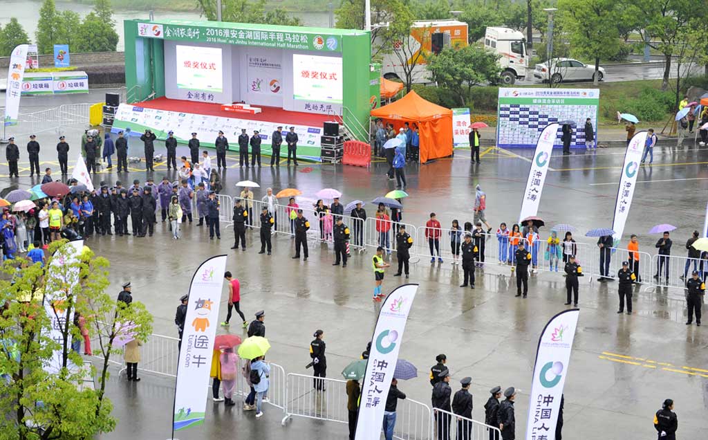由中國田徑協(xié)會、江蘇省體育局、淮安市人民政府聯(lián)合主辦,金湖縣人民政府、淮安市體育局、江蘇省體育產(chǎn)業(yè)集團(tuán)承辦的“2016淮安金湖國際半程馬拉松”比賽,于2016年5月15日上午8:30分在金湖縣荷花廣場鳴槍開賽,來自世界各地及我國長跑愛好者10000余名運動員參加了比賽?;窗彩斜0卜?wù)總公司派出700余名安保人員冒雨執(zhí)勤,提升了保安隊伍在復(fù)雜天氣條件下的快速反應(yīng)和安保執(zhí)勤的能力。
