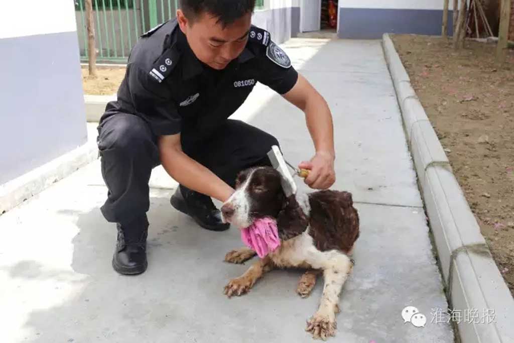 訓(xùn)練結(jié)束,警犬回舍,趙亞峰帶著記者參觀起了犬舍。在一間犬舍前,趙亞峰停下了腳步,靜靜地看著里面的一只史賓格犬。不像剛才訓(xùn)練的警犬,這只犬顯得慵懶,沒有精神,眼睛里居然還有不少眼眵。趙亞峰打開犬舍,將這只犬牽了出來,拿起一塊毛巾,用清水洗干凈,把犬溫軟地抱在懷里,輕輕地為它擦拭眼眵。洗干凈后,趙亞峰拿來一把梳子,為它梳理著毛發(fā),犬閉著眼睛很享受。