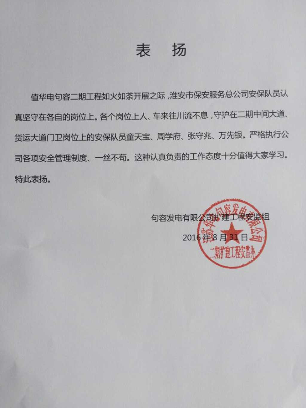 2016年8月31日,淮安保安駐外分公司收到江蘇華電句容發(fā)電有限公司發(fā)來的表揚信。表揚淮安保安駐句容執(zhí)勤點的四名保安隊員童天保、周學府、張守兆、萬先銀認真堅守各自崗位、嚴格執(zhí)行服務單位各項安全管理的行為。