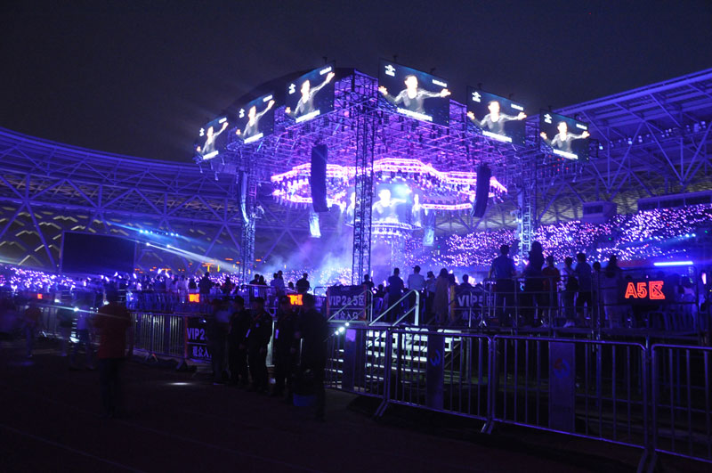 5月5日,“A CLASSIC TOUR學(xué)友·經(jīng)典世界演唱會”揚(yáng)州站,以人防中心王錦春總監(jiān)為領(lǐng)導(dǎo)管理班子,積極與主辦方聯(lián)絡(luò),在演唱會前一天,組織精干管理人員踏勘現(xiàn)場,提出合理化安保建議,精心組織崗位分配,各項前期準(zhǔn)備工作有條不紊地開展。5日上午10時,第一批100名大型活動特勤安保隊伍進(jìn)駐揚(yáng)州體育公園,下午16時,100名專業(yè)安檢員和特勤隊員準(zhǔn)時到達(dá)各預(yù)定崗位開展工作。在整場演唱會活動中,安檢崗位中查獲各類違禁品5000余件。因主辦方設(shè)定預(yù)檢票口位置較少,造成大量觀眾聚集,我們合理調(diào)集機(jī)動隊伍認(rèn)真做好人員疏散工作,避免了事故隱患。