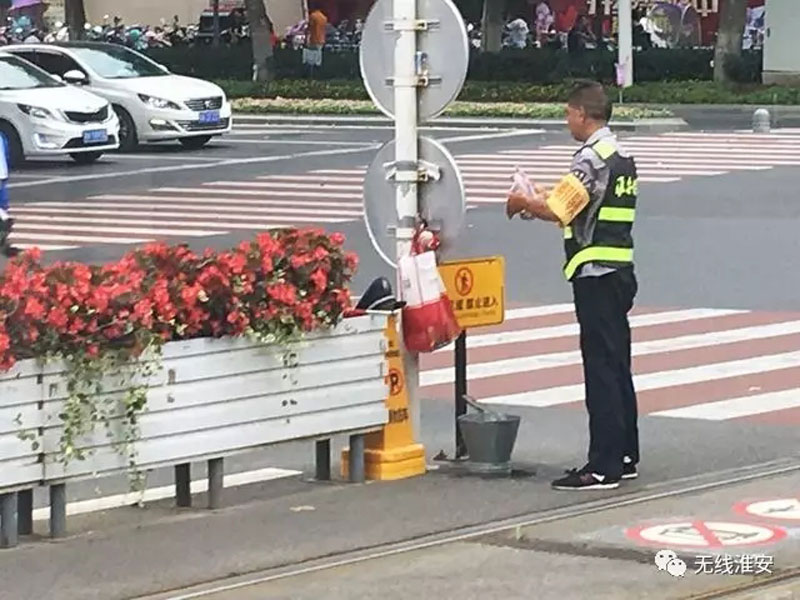 夏天熱是其次,李海峰自己帶個(gè)毛巾和水桶還能降降溫,冬天更加讓人難以忍受。在路上執(zhí)勤,如果遇上刮風(fēng)下雪,不管穿多厚的衣服,都冷的刺骨??刹还芴鞖馊绾螑毫?,李海峰都堅(jiān)持著標(biāo)準(zhǔn)規(guī)范的站姿、手勢和文明用語,他說:“因?yàn)槲掖髦?lsquo;文明引導(dǎo)員’的袖標(biāo)呢,自己要以身作則。”