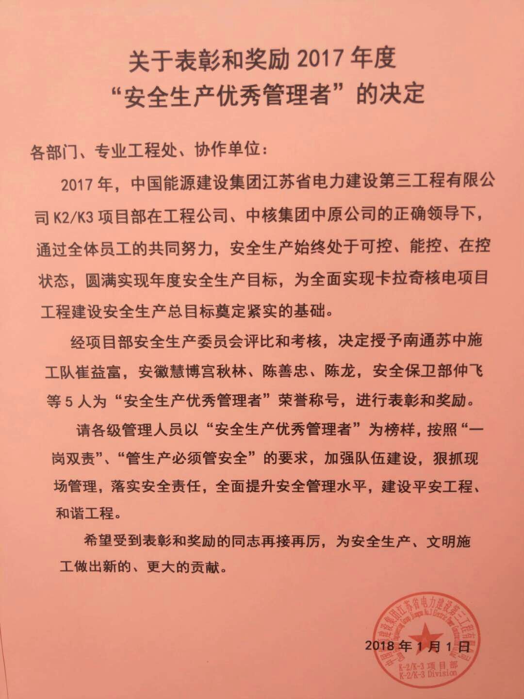 2018年第一天,總公司駐巴基斯坦卡拉奇執(zhí)勤點(diǎn)保安員受到中國能源建設(shè)集團(tuán)江蘇省電力建設(shè)第三工程有限公司K2/K3項(xiàng)目部的表彰和獎(jiǎng)勵(lì),仲飛榮獲“安全生產(chǎn)優(yōu)秀管理者”稱號;萬龍虎、張勇、陳素建、徐浩、呂志標(biāo)、劉軍等6名安全員榮獲“安全衛(wèi)士”稱號。
