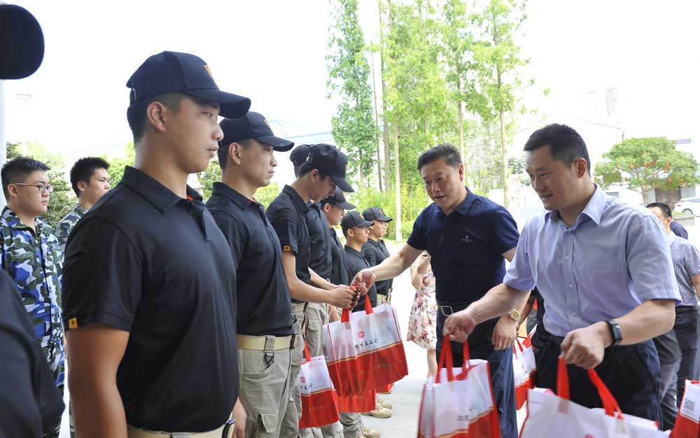8月8日下午,淮安市總工會(huì)和市公安局工會(huì)等領(lǐng)導(dǎo)一行來(lái)到總公司,在公司婁伯翱總經(jīng)理陪同下,親切看望和慰問(wèn)了正在訓(xùn)練中的押運(yùn)新隊(duì)員和犬防大隊(duì)、安保中專班等員工,并將防暑物品送到他們手中,表達(dá)對(duì)奮戰(zhàn)在安保一線的保安隊(duì)伍的敬意,并勉勵(lì)大家立足本職,再接再厲,進(jìn)一步為淮安經(jīng)濟(jì)建設(shè)保駕護(hù)航。