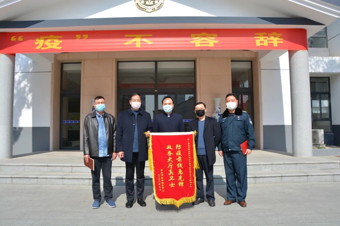 3月17日上午,淮安市行政審批局副局長丁永祥,辦公室主任劉亞明專程來到總公司對(duì)在疫情期間派駐在政務(wù)中心的保安員們辛勤付出送上錦旗和感謝信,總公司副總經(jīng)理王錦春陪同。