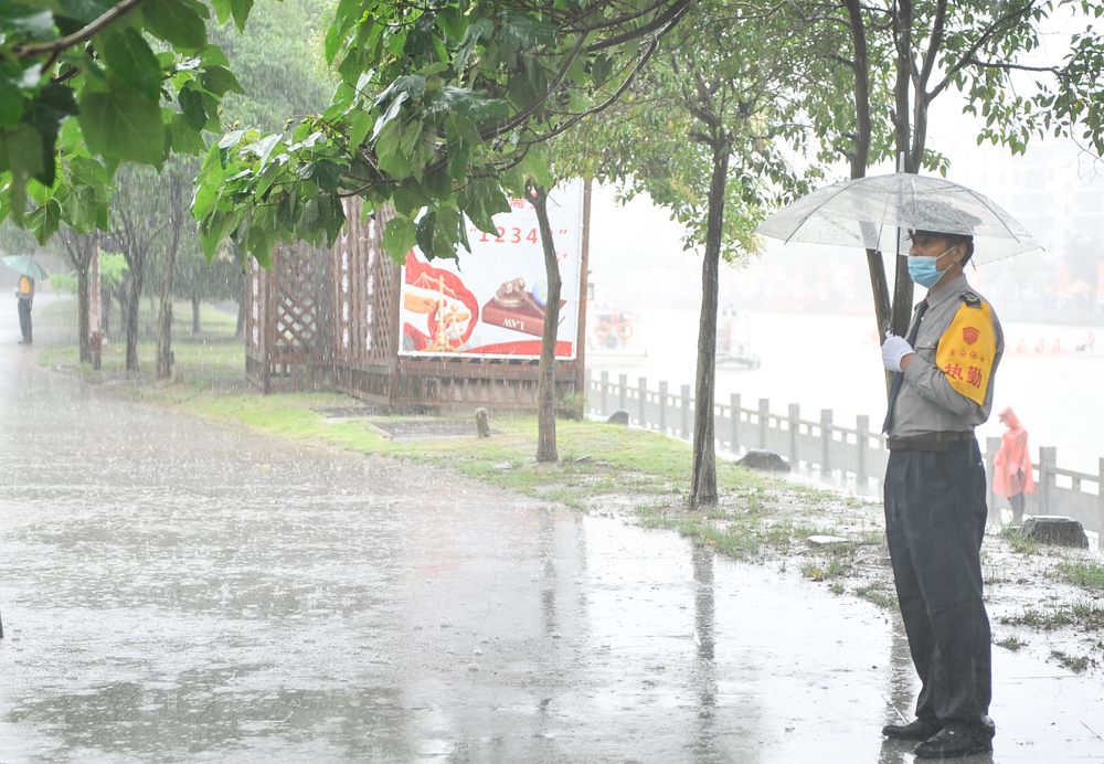 23日清晨6時,總公司抽調(diào)600余名保安人員按照方案提前布崗到位,在風(fēng)雨中形成一道堅實的人形屏障風(fēng)景線。面對肆虐的風(fēng)雨,執(zhí)行現(xiàn)場安保任務(wù)的隊員們始終堅守在崗位上,有序開展安全檢查、體溫檢測、沿途守護、維持賽場秩序,一方面繼續(xù)抓牢抓實疫情防控,一方面認真做好各項安保工作,精心保障賽事活動安全、有序開展。