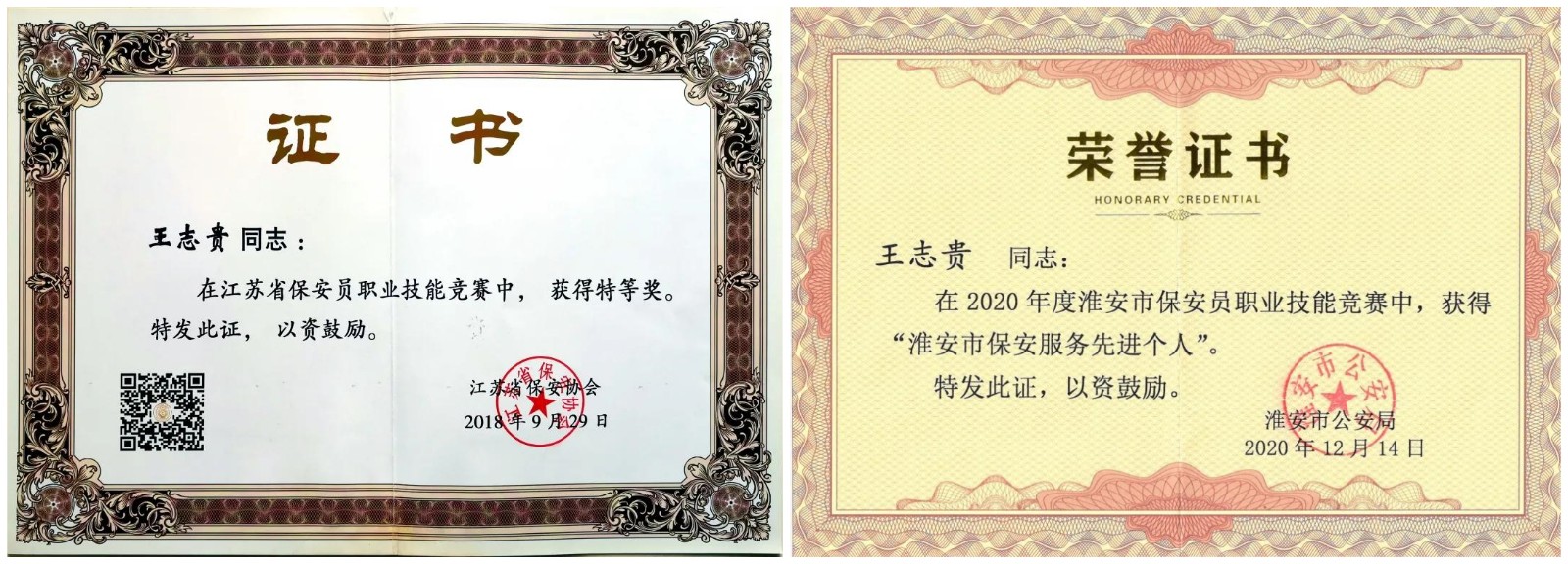 押運車長王志貴同志,本科學歷,中共黨員,保安員國家職業(yè)技能等級二級,保安技師資格證。工作十幾年來,他始終保持軍人本色,服從命令,聽從指揮,愛崗敬業(yè),不斷挖掘自己的內(nèi)在潛能,多次參加省、市保安職業(yè)技能大賽,先后榮獲省、市數(shù)次獎項:2018年度,在江蘇省保安職業(yè)技能競賽中,獲得“特等獎”,被授予“江蘇省技術能手稱號”,被總公司評為“十佳保安”;2019年度,被總公司評為“優(yōu)秀車長”、“押運紅旗車組”;2020年度,被授予“江蘇省技術能手”、“江蘇省五一創(chuàng)新能手”、“江蘇省青年崗位能手”、“淮安市青年崗位能手”、“淮安市技術能手”、“淮安市五一創(chuàng)新能手” 等榮譽稱號,被淮安市公安局評為“淮安市保安服務先進個人”。